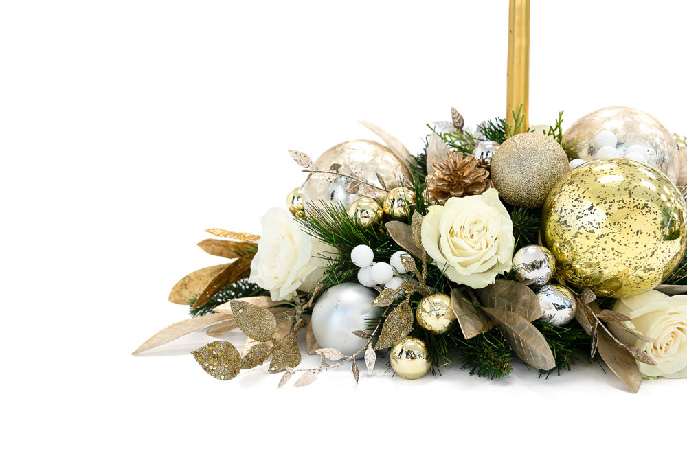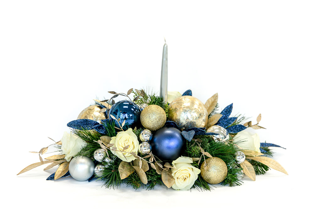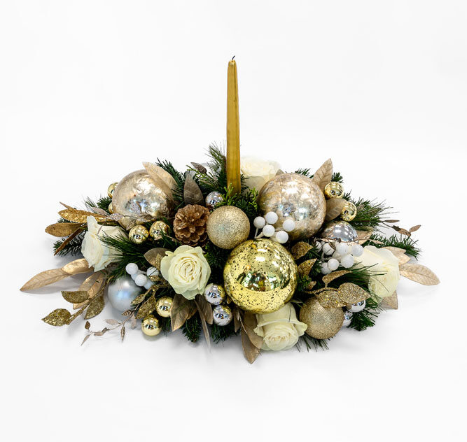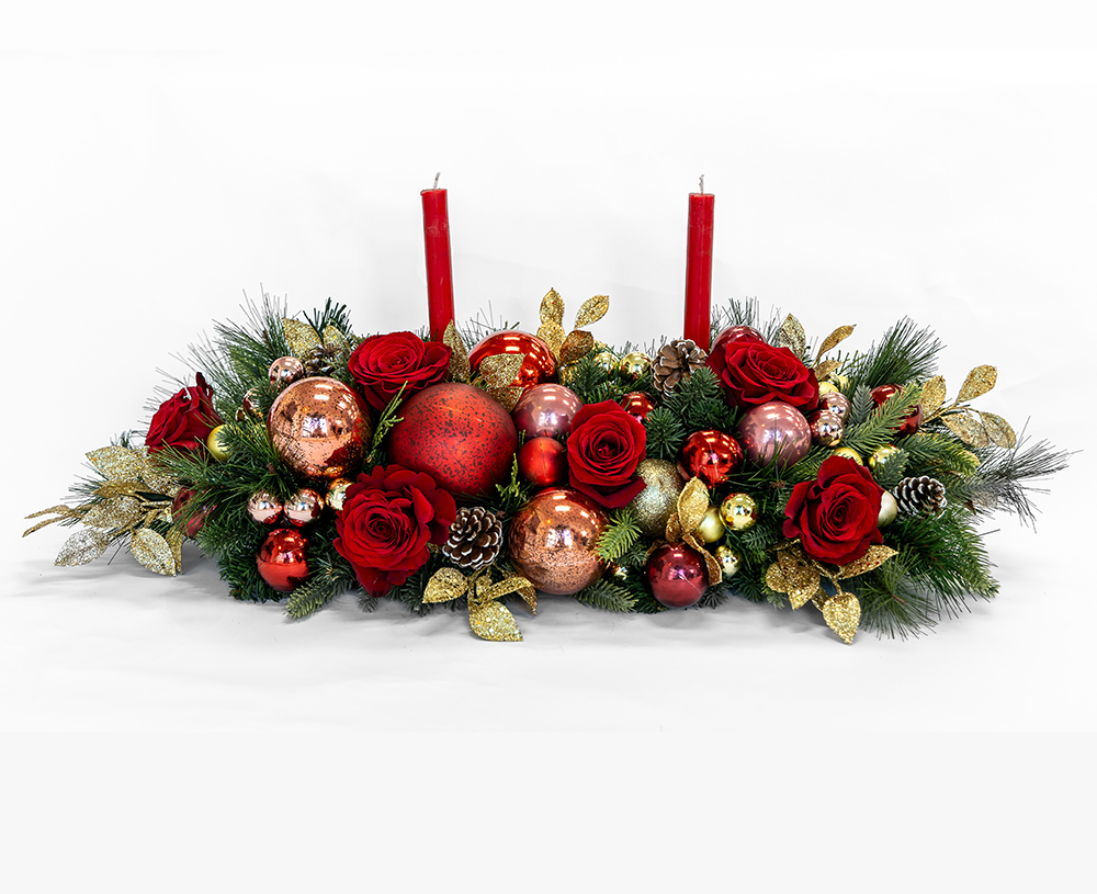 An elegant table centerpiece featuring Christmas greenery, enhanced with a mix of baubles along with subtle touches of fresh florals and a tapered candle for a refined, festive touch.