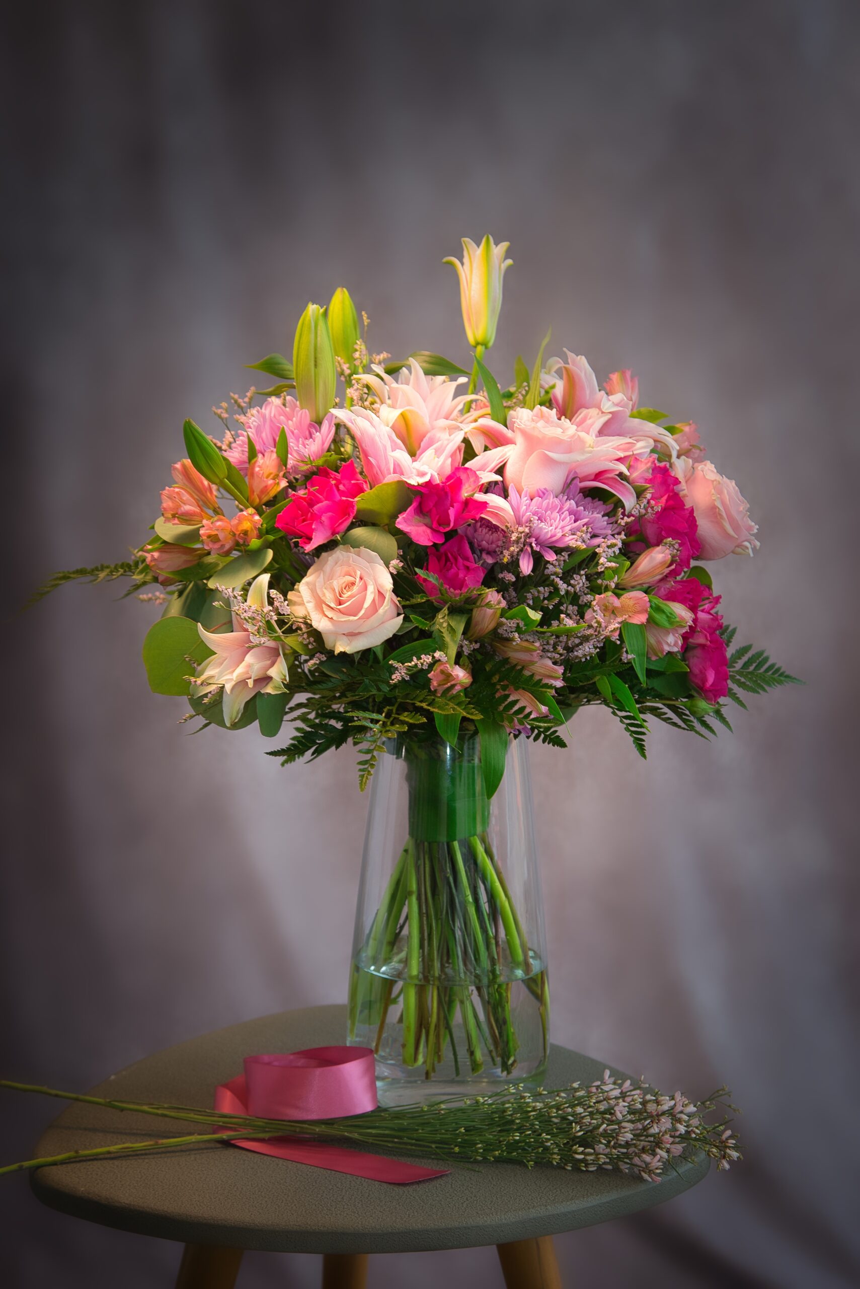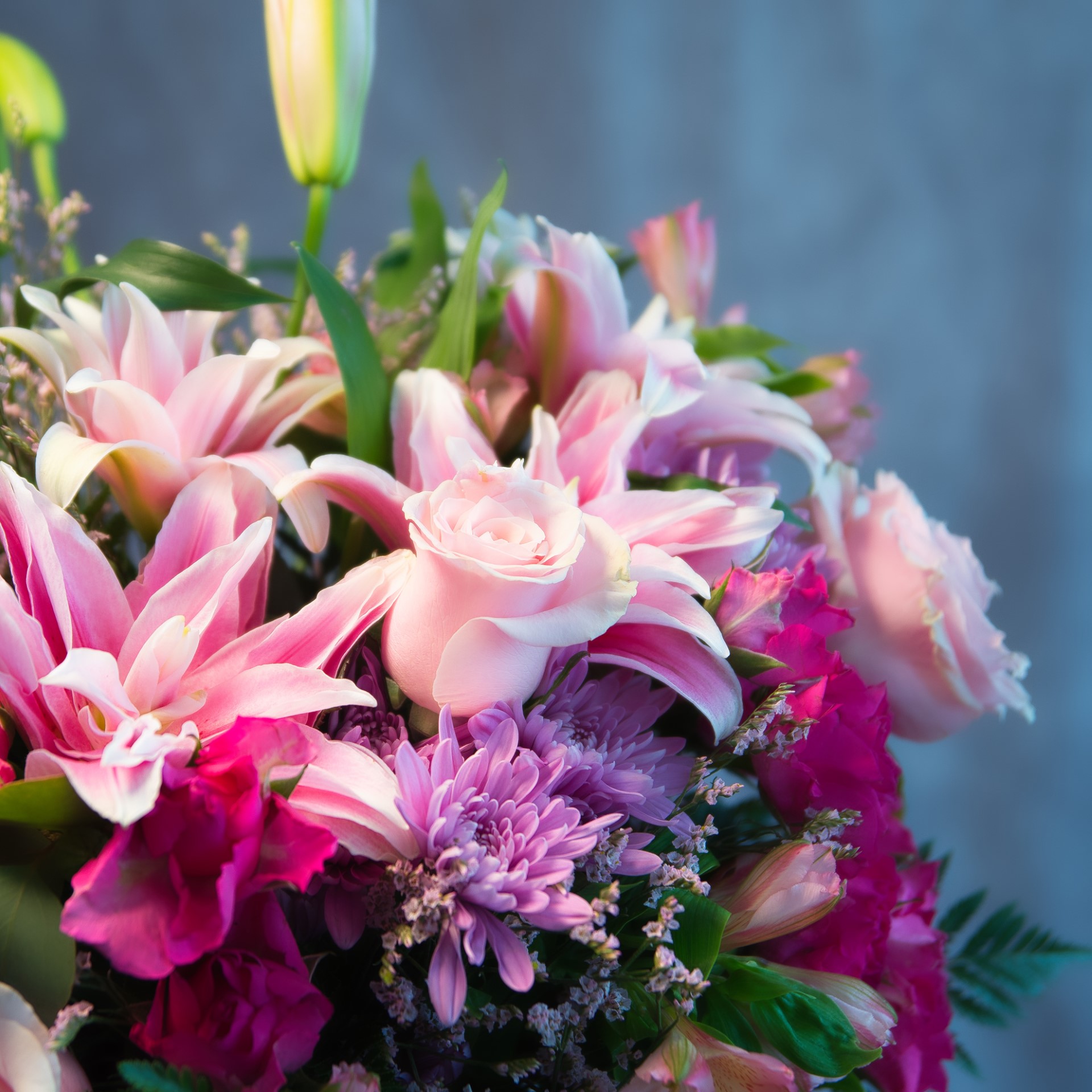 A beautiful combination of red & pink florals including lilies, roses and blooms. Perfect for your Valentine!